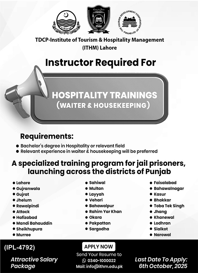 Institute of Tourism & Hotel Management ITHM Lahore, lahore Punjab Pakistan invites applications from eligible candidates for the post of instructor as per advertisement of September 26, 2025 published in daily Nawaiwaqt Newspaper. Persons with Bachelor etc. education can apply.