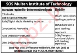 SOS Multan Institute of Technology jobs advertisement dated about 23 July 2023 in daily Jang Newspaper invites application for the vacant post of digital media marketing instructor, computerized accounting instructor, social media marketing instructor, dress making instructor, it instructor, web designing instructor, dress designing instructor and hand embroidery instructor in Multan, multan Punjab Pakistan. B.com, BCS, Master, BIT, BBA and Others etc. educational qualification will be preferred.