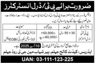 Cadet College Jhelum jobs advertisement dated about 5 August 2025 in daily Jang Newspaper invites application for the vacant post of drill instructor and pt instructor in GT Road Jhelum, jhelum Punjab Pakistan. Bachelor and Master etc. educational qualification will be preferred.