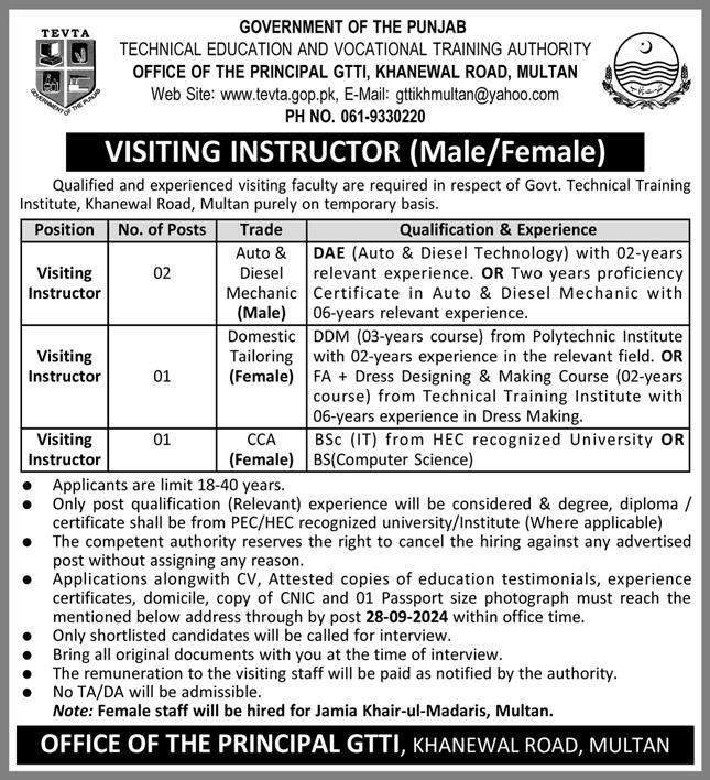 Vacant posts including visiting instructor auto diesel, visiting instructor mechanic, visiting instructor domesting tailoring, instructor and visiting instructor are announced in Govt Technical Training Institute Multan, multan Punjab Pakistan as per 19 September 2024 advertisement in daily Express Newspaper. Master, Bachelor and DAE etc. educational qualification will be preferred.