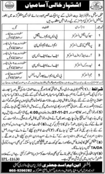 Social Welfare & Bait ul Maal invites applications from highly educated expert and experienced professional for the post of Spoken English Instructor, Professional Cook Instructor, Art and Craft Instructor, Leather Work Instructor, Gym Instructor in Muzaffargarh.