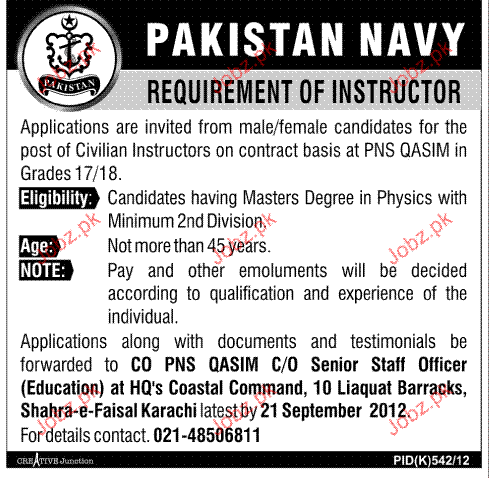 Instructors are required in Pakistan Navy in Karachi