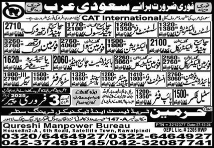 Harmain Trade Test & Technical Training Center latest Overseas Industrial jobs and others can be applied till 3 February 2025 or as per closing date in newspaper ad. Read complete ad online to know how to apply on latest Harmain Trade Test & Technical Training Center job opportunities. Salary varies from 296000. Earn extra money with overtime. Employer provides accommodation, food, transport and medical facility.
