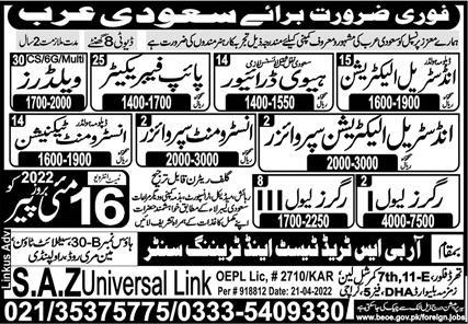 Apply at SAZ Universal Link latest Overseas jobs in Industrial and departments before closing date which is around May 16, 2022 or as per closing date in newspaper ad. Read complete ad online to know how to apply on latest SAZ Universal Link job opportunities. Salary varies from 155000. Earn extra money with overtime. Free accommodation, transport and medical may be available.