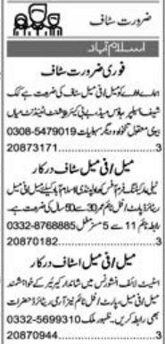 Private Company Islamabad, islamabad Islamabad Pakistan invites applications from eligible candidates for the post of telemarketing officer, house maid, husband wife, insurance agent, helper, cook, patient attendant, baby care and chef as per advertisement of October 7, 2022 published in daily Express Newspaper. Candidates with Bachelor, Middle, Intermediate and Matric etc. educational background will be preferred.