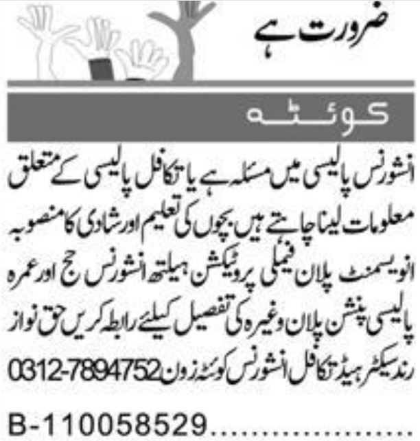 Insurance Company is looking for candidates for following posts as per job advertisement published in daily Express Newspaper of December 11, 2024 for location Quetta, quetta Balochistan Pakistan: