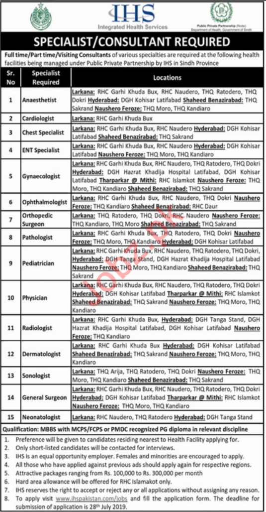 Integrated Health Services IHS is seeking applications from medical, health, mbbs, doctors and experienced candidates for the positions of Anesthetist, Cardiologist, Chest Specialist, ENT Specialist, Gynaecologist, Ophthalmologist, Orthopedic Surgeon, Pathologist, Pediatrician, Physician, Radiologist, Dermatologist, Sonologist, General Surgeon & Neonatologist in Larkana, Hyderabad, Naushahro Feroze, Mithi, Tharparkar & Shaheed Benazirabad.