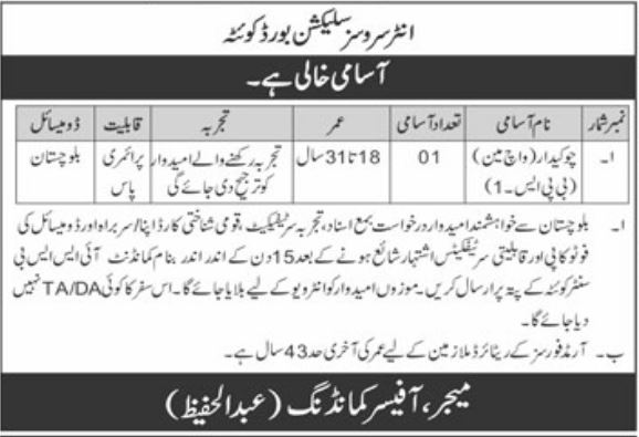 Inter Services Selection Board ISSB Quetta, quetta Balochistan Pakistan invites applications from eligible candidates for the post of watchman and chowkidar as per advertisement of March 5, 2023 published in daily Roznama 92 News Newspaper. Preferred Education is Primary etc.