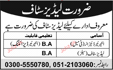 Interior Designers And Ladies Staff Job Opportunity