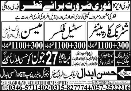 Hassan Abdal Trade Test & Training Center jobs advertisement dated about 26 June 2025 in daily Express Newspaper invites application for the vacant post of steel fixer, plaster mason, mason, tile mason, shuttering carpenter, block mason and interlock mason in Doha, doha Qatar. Candidates with Matric and Intermediate etc. educational background will be preferred.