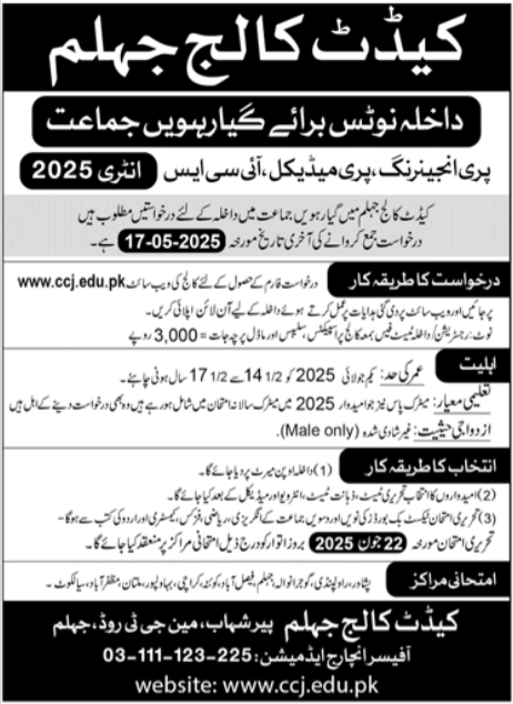 Intermediate Admission 2025 in cadet College Jhelum