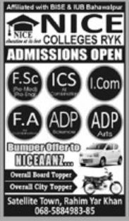 Nice College has announced admissions 2022 for FSc, ICS, I.Com, FA, ADP. Nice College Rahim Yar Khan Punjab Pakistan welcomes students to apply for admissions in academic year 2022 in Teaching College. Students for admissions in I.com, ADP and Intermediate can apply for online or campus classes as per Private institute criteria till admission closing date February 10, 2022. Read newspaper ad for exact details.