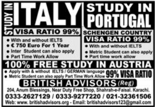 Admissions in British Advisors 2023 for Intermediate, Bachelors, Masters has been announced. Eligible students who qualify as per admission criteria in British Advisors Portugal Other Europe can apply in Science University for academic year 2023. Students who want to enroll for academic session 2023 in Master, Intermediate and Bachelor qualification and admission criteria for International institute can apply till last date 8 February 2023. Read newspaper ad for exact details.