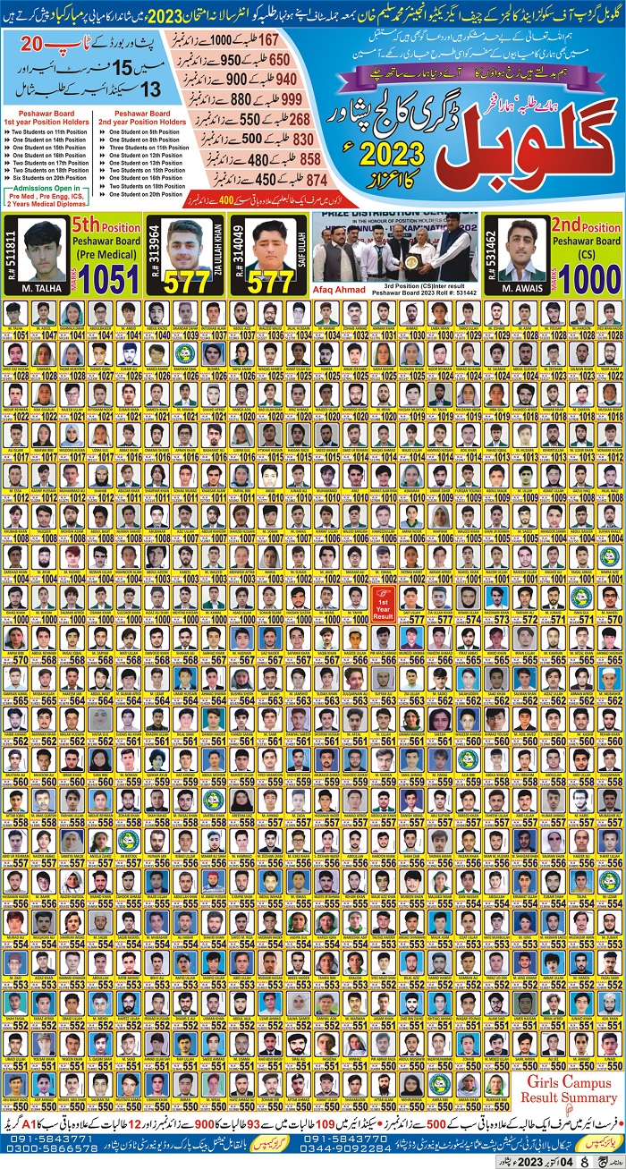 Global Degree College Intermediate, Medical Diploma Programs admissions 2023 has been started. Students who want to take admissions in Global Degree College Peshawar Khyber Pakhtunkhwa KPK Pakistan for academic year 2023 to continue education in Science College can apply. Students who want to enroll for academic session 2023 in Intermediate and Diploma qualification and admission criteria for Private institute can apply till last date 8 November 2023. Read newspaper ad for exact details.
