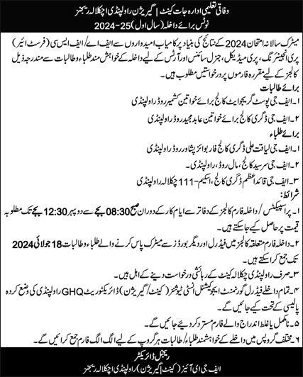 Federal Government Educational Institutions Intermediate Classes admissions 2024 has been started. Students can enroll for admissions in Federal Government Educational Institutions Rawalpindi Punjab Pakistan for academic year 2024 to continue campus based or online education in Science College. Eligible students for fulfilling criteria for admissions in Intermediate can enroll as per Government admission policy 2024 till closing date 18 July 2024. Read newspaper ad for exact details.