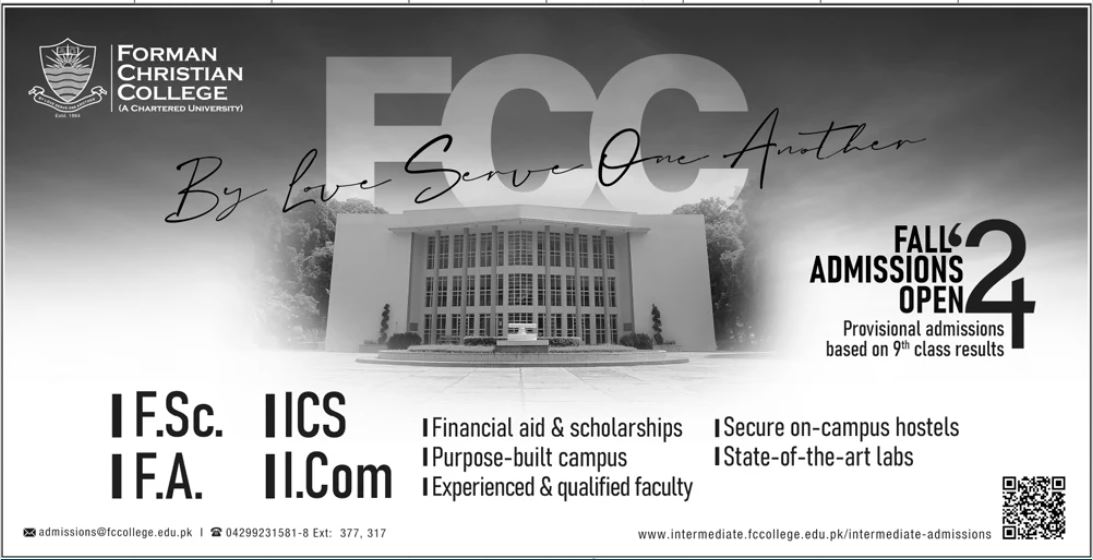 Forman Christian College admissions 2024 for FSc, ICS, FA, I.Com has been announced. Students can enroll for admissions in Forman Christian College Lahore Punjab Pakistan for academic year 2024 to continue campus based or online education in Science College. Students for admissions in ICS, Intermediate and I.com & criteria can apply as per Private institute admission policy 2024 before closing date May 27, 2024 as per advertisement. Read newspaper ad for exact details.