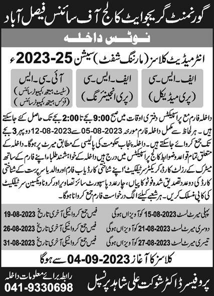 Government Graduate College of Science Intermediate Classes, FSc, ICS admissions 2023 has been started. Eligible students can apply for academic admissions 2023 in Government Graduate College of Science Faisalabad Punjab Pakistan for Science College. Students for admissions in Intermediate and ICS can apply for online or campus classes as per Government institute criteria till admission closing date August 5, 2023. Read newspaper ad for exact details.