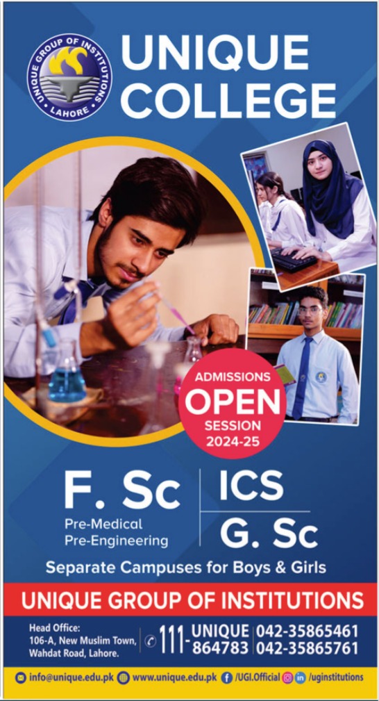 Unique College UC FSc, ICS admissions 2024 has been announced. Students can enroll for admissions in Unique College UC Lahore Punjab Pakistan for academic year 2024 to continue campus based or online education in Science College. Eligible students for fulfilling criteria for admissions in ICS and Intermediate can enroll as per Private admission policy 2024 till closing date 5 August 2024. Read newspaper ad for exact details.