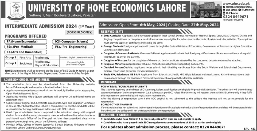 University of Home Economics has announced admissions 2024 for FA, FSc, ICS. Eligible students can apply for academic admissions 2024 in University of Home Economics Lahore Punjab Pakistan for Science University. Students who want to enroll for academic session 2024 in ICS and Intermediate qualification and admission criteria for Government institute can apply till last date 27 May 2024. Read newspaper ad for exact details.