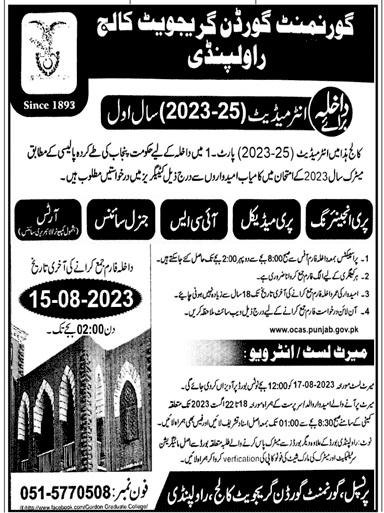 Government Gordon Graduate Colllege Rawalpindi FA, FSc, ICS admissions 2023 has been started. Students can enroll for admissions in Government Gordon Graduate Colllege Rawalpindi Rawalpindi Punjab Pakistan for academic year 2023 to continue campus based or online education in Science College. Students for admissions in Intermediate and ICS & criteria can apply as per Government institute admission policy 2023 before closing date August 15, 2023 as per advertisement. Read newspaper ad for exact details.