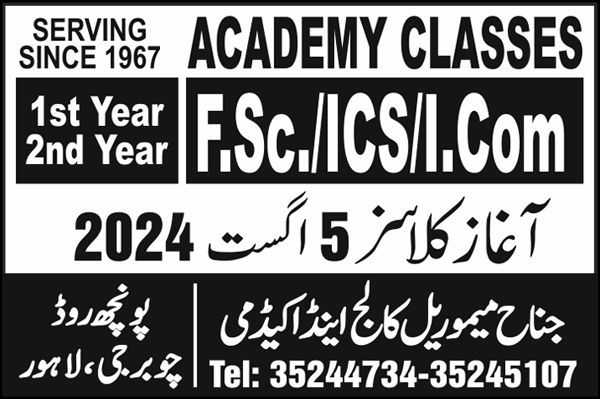 Jinnah Memorial College and Academy has announced admissions 2024 for FSc, ICS, I.Com. Eligible students who qualify as per admission criteria in Jinnah Memorial College and Academy Lahore Punjab Pakistan can apply in Science College for academic year 2024. Eligible candidates for admissions in I.com, Intermediate and ICS can apply as per Private institute criteria and before closing date 31 July 2024 after reading advertisement online. Read newspaper ad for exact details.