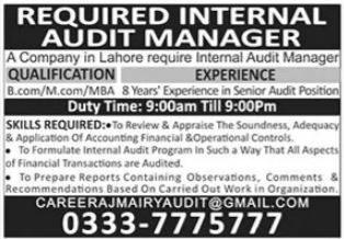 Private Company jobs advertisement dated about 5 June 2022 in daily The News Newspaper invites application for the vacant post of internal audit manager in Lahore, lahore Punjab Pakistan. Preferred Education is MBA, M.com and B.com etc.