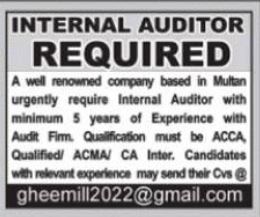 Vacant posts including internal auditor are announced in Ghee Mill Multan, multan Punjab Pakistan as per 8 May 2022 advertisement in daily Nawaiwaqt Newspaper. Persons with CA and ACCA etc. education can apply.