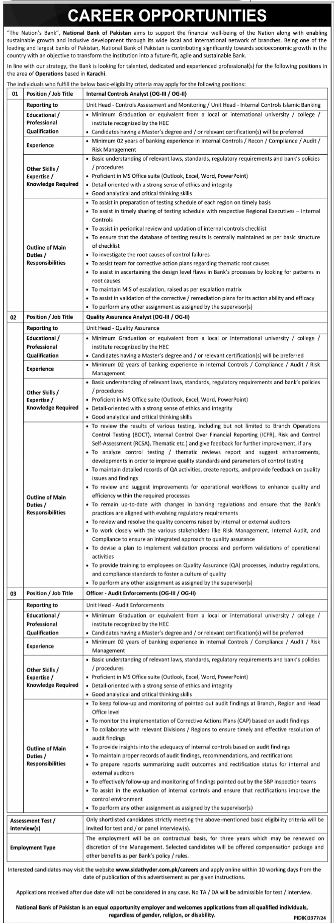 Internal Controls Analyst Jobs In National Bank Of Pakistan