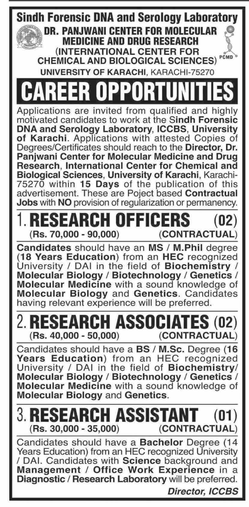 International Center For Chemical & Biological Sciences Karachi, karachi Sindh Pakistan invites applications from eligible candidates for the post of research associate, research assistant and research officer as per advertisement of February 27, 2022 published in daily Dawn Newspaper. Mphil and Phd etc. educational qualification will be preferred.