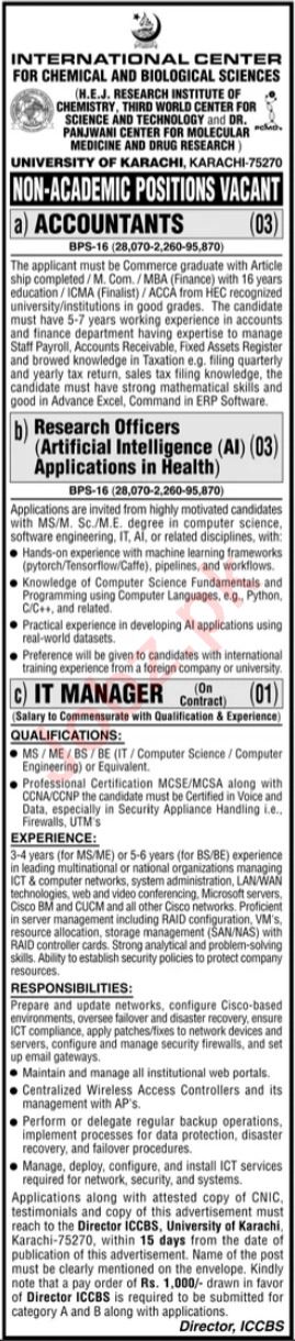 International Center For Chemical & Biological Sciences invites applications for job positions advertised in daily Jang dated 12 May 2024 for following vacancies in Karachi, karachi Sindh Pakistan.