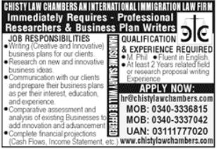 Chisty Law Chambers Lahore Punjab Pakistan invites applications from eligible candidates for the post of Research Business Plan Writer as per advertisement of February 6, 2022 published in daily Jang Newspaper. Mphil etc. educational qualification will be preferred.