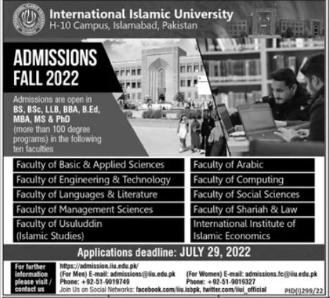 International Islamic University Islamabad IIUI BS, BSc, LLB, BBA, B.Edd, MBA, MS & PhD admissions 2022 has been started. Eligible students can apply for academic admissions 2022 in International Islamic University Islamabad IIUI Islamabad Islamabad Pakistan for Science University. Students for admissions in MS, BSc Hons, B.ed, Phd, BS, LLb, MBA and Bachelor can apply for online or campus classes as per Government institute criteria till admission closing date July 29, 2022. Read newspaper ad for exact details.