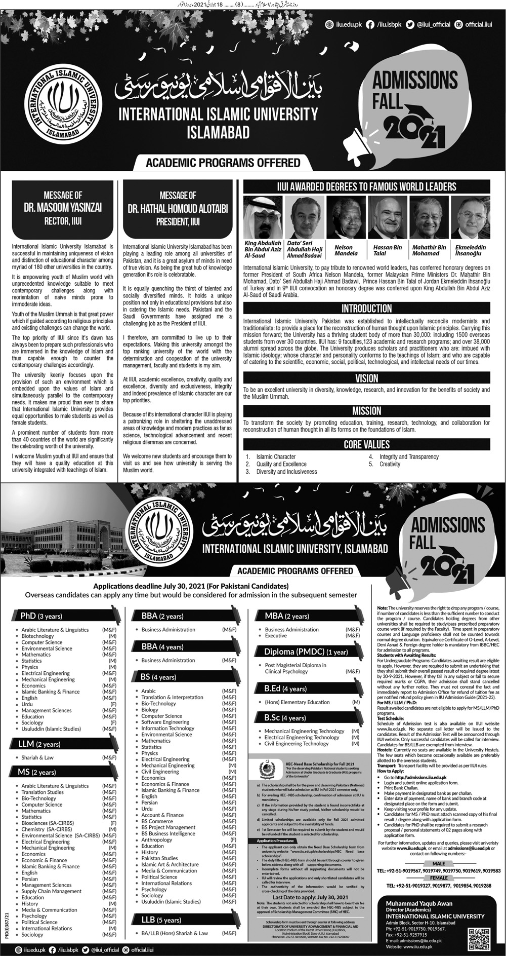 International Islamic University Islamabad IIUI is a public research university has announced admissions in PhD, LLM, MS, BBA, BS, LLB, MBA, Diploma, B.Ed and BSc degree programs 2021. Read newspaper ad for exact details.