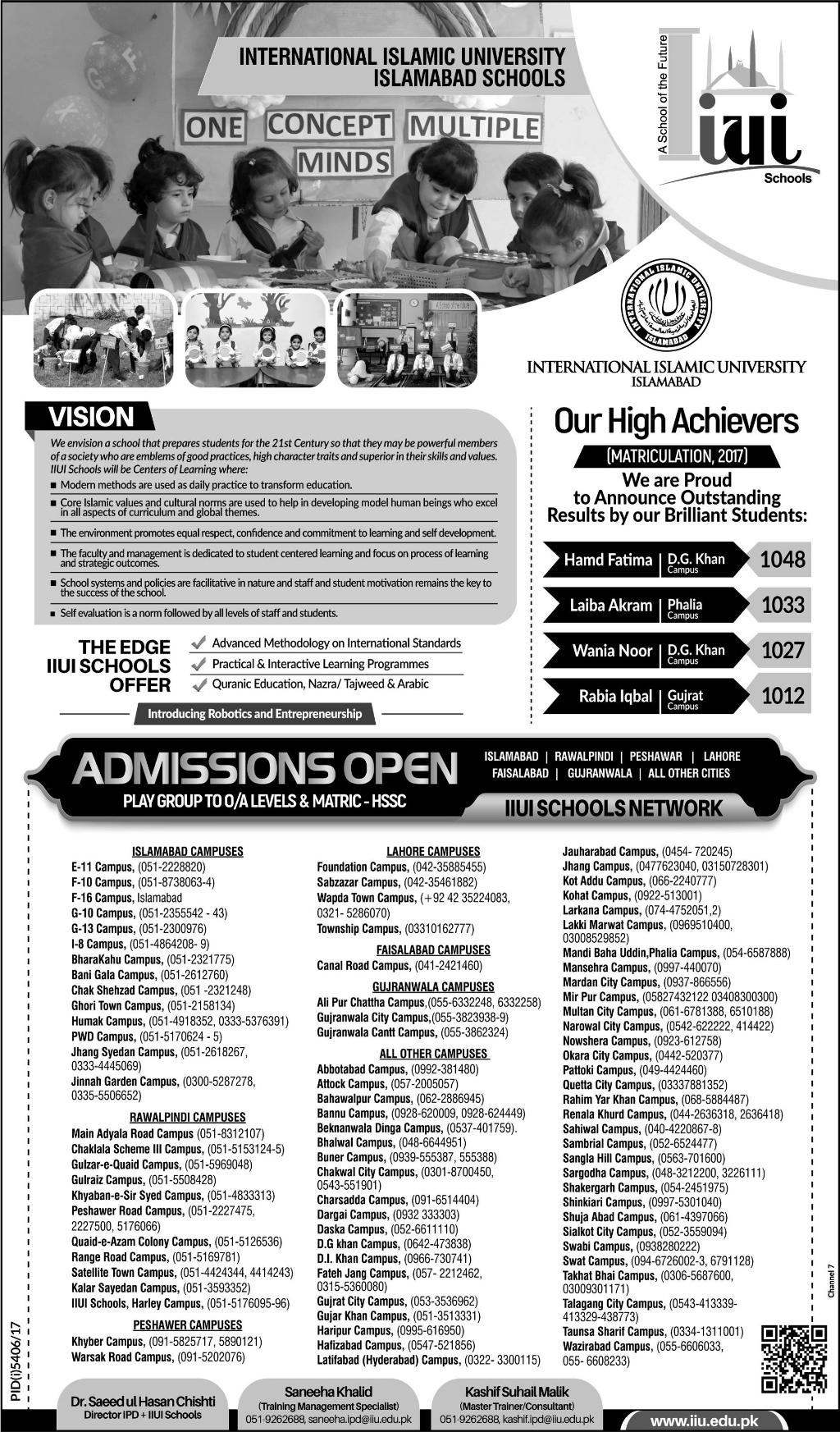 International Islamic University School Admission in Playgroup to Class X , HSSc & A Level in Islamabad, Lahore and Other Cities of Pakistan. Admission Session 2018-2019. Read newspaper ad for exact details.