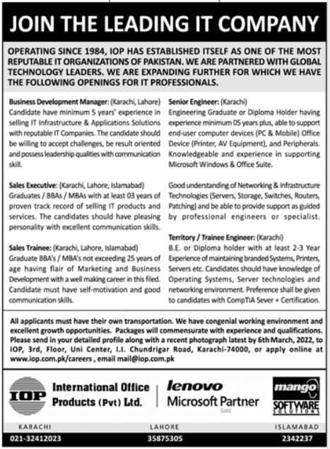 International Office Products Pvt Limited invites applications for job positions advertised in daily Jang dated 20 February 2022 for following vacancies in Islamabad, islamabad Islamabad Pakistan.