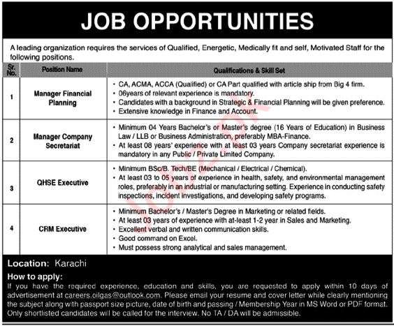 Oil Gas Company invites applications for job positions advertised in daily Nawaiwaqt dated 21 October 2024 for following vacancies in Karachi, karachi Sindh Pakistan.
