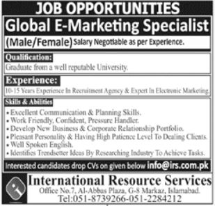 International Resource Services jobs advertisement dated about 9 April 2022 in daily Jang Newspaper invites application for the vacant post of global e marketing specialist in Islamabad, islamabad Islamabad Pakistan. Persons with Master and Bachelor etc. education can apply.