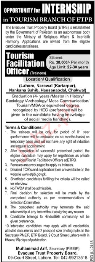 Vacant posts including tourism facilitation officer are announced in Evacuee Trust Property Board Lahore, nankana sahib, narowal, chakwal, lahore and hassan abdal Punjab Pakistan as per 19 February 2023 advertisement in daily Jang Newspaper. Candidates with MBA, Master and Bachelor etc. educational background will be preferred.