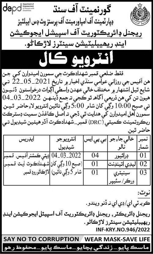 Regional Directorate of Special Education is looking for candidates for following posts as per job advertisement published in daily Kawish Newspaper of March 1, 2022 for location Larkana, larkana Sindh Pakistan: