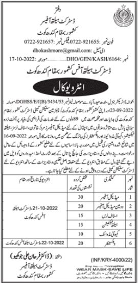 District Health Office jobs advertisement dated about 21 October 2022 in daily Jang Newspaper invites application for the vacant post of vaccinator, women medical officer, staff nurse, medical officer, community midwife and health technician in Kandhkot, kandhkot and kashmore Sindh Pakistan. MBBS, Others and Intermediate etc. educational qualification will be preferred.
