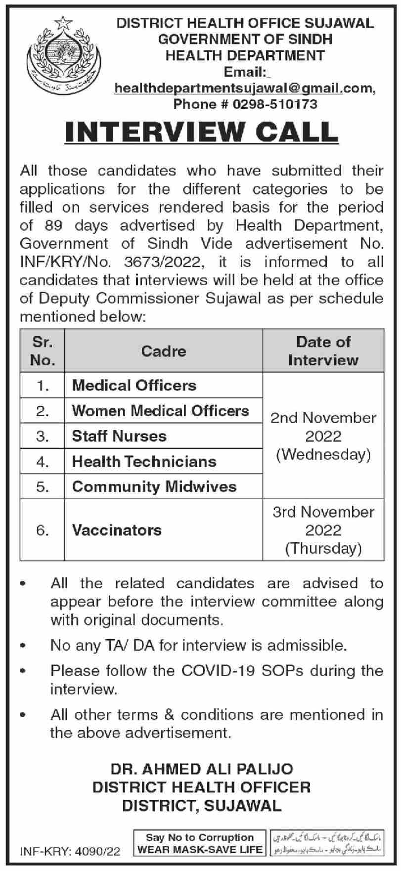 Vacant posts including women medical officer, staff nurse, health technician, medical officer, community midwife and vaccinator are announced in Health Department Sujawal, sujawal Sindh Pakistan as per 27 October 2022 advertisement in daily Dawn Newspaper. Persons with Intermediate, MBBS, Matric and Others etc. education can apply.