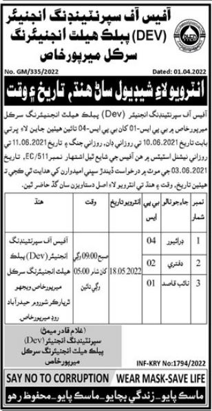 Vacant posts including naib qasid, daftari and driver are announced in Public Health Engineering Circle Mirpur Khas, mirpur khas Sindh Pakistan as per 13 April 2022 advertisement in daily Kawish Newspaper. Middle and Primary etc. educational qualification will be preferred.