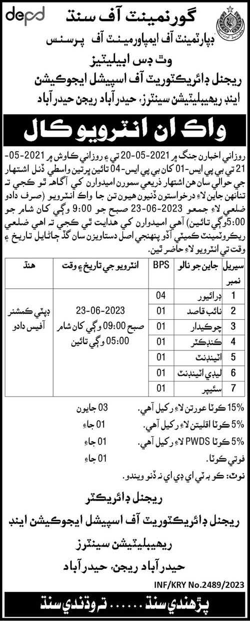 Department of Empowerment of Persons with Disabilities Hyderabad, hyderabad Sindh Pakistan invites applications from eligible candidates for the post of naib qasid, chowkidar, attendant, lady attendant, conductor, driver and sweeper as per advertisement of June 16, 2023 published in daily Kawish Newspaper. Candidates with Primary and Middle etc. educational background will be preferred.