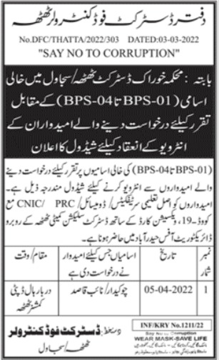 Food Department Thatta, sujawal and thatta Sindh Pakistan invites applications from eligible candidates for the post of chowkidar and naib qasid as per advertisement of March 11, 2022 published in daily Jang Newspaper. Persons with Middle and Primary etc. education can apply.