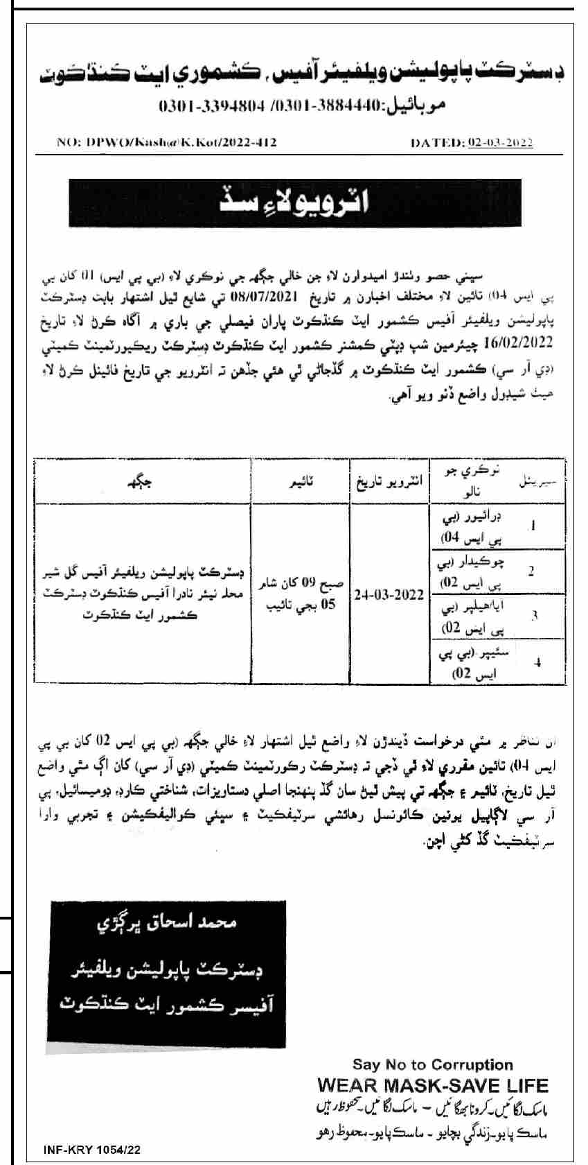 Vacancies in District Population Welfare Office Advertisement March 2022