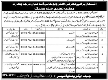 Education Department jobs advertisement dated about 21 March 2022 in daily Ausaf Newspaper invites application for the vacant post of mali, lab attendant, khakroob, chowkidar, balawi and naib qasid in Jhang, jhang and shorkot Punjab Pakistan. Middle and Primary etc. educational qualification will be preferred.