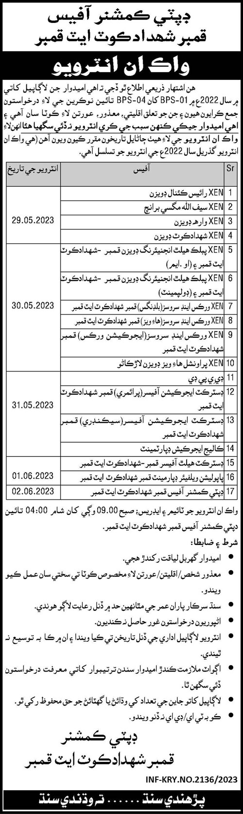 Deputy Commissioner Office jobs advertisement dated about 24 May 2023 in daily Kawish Newspaper invites application for the vacant post of bps one to bps four in Qambar Shahdadkot, qambar shahdadkot Sindh Pakistan. Educational qualifications required Middle and Primary etc.