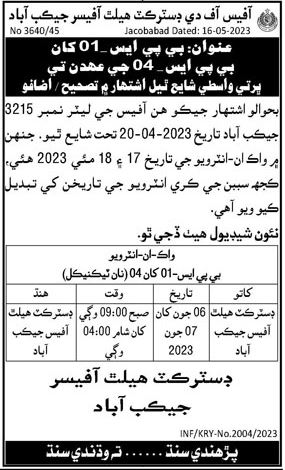 Vacant posts including chowkidar, sanitary petrol, tailor, naib qasid, bhishti, driver, ward servant, dai, dhobi, ward boy, sanitary worker and cook are announced in District Health Office Jacobabad, jacobabad Sindh Pakistan as per 19 May 2023 advertisement in daily Kawish Newspaper. Educational qualifications required Middle and Primary etc.