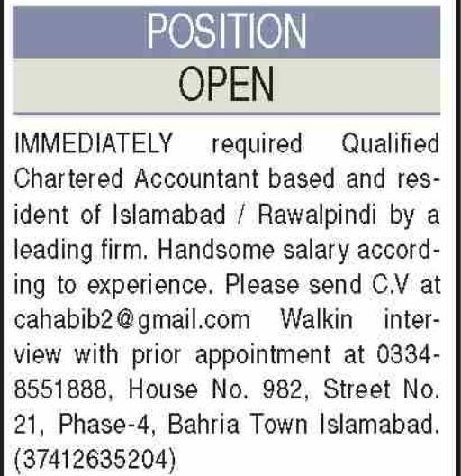 Private Company Islamabad Pakistan invites applications from eligible candidates for the post of chartered accountant as per advertisement of February 11, 2022 published in daily Dawn Newspaper. Educational qualifications required ACCA and CA etc.