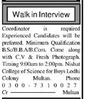 Interview For Coordinator Job At Nishat College Of Science